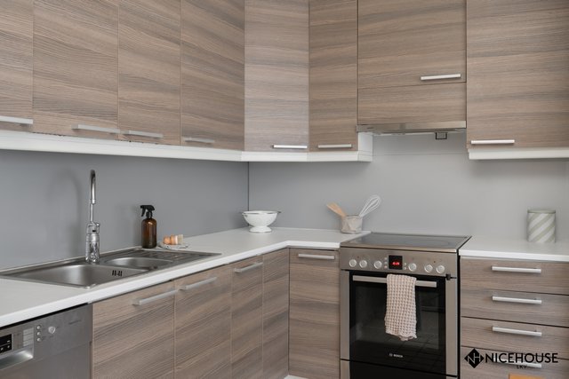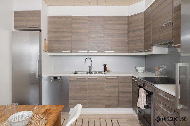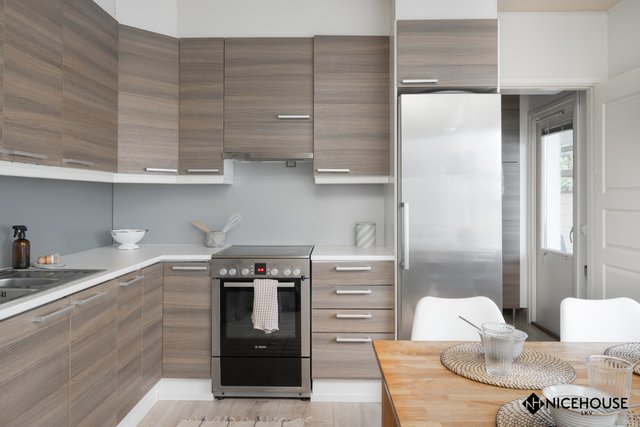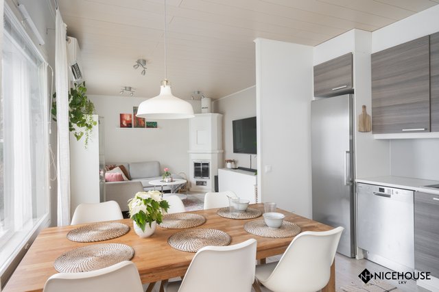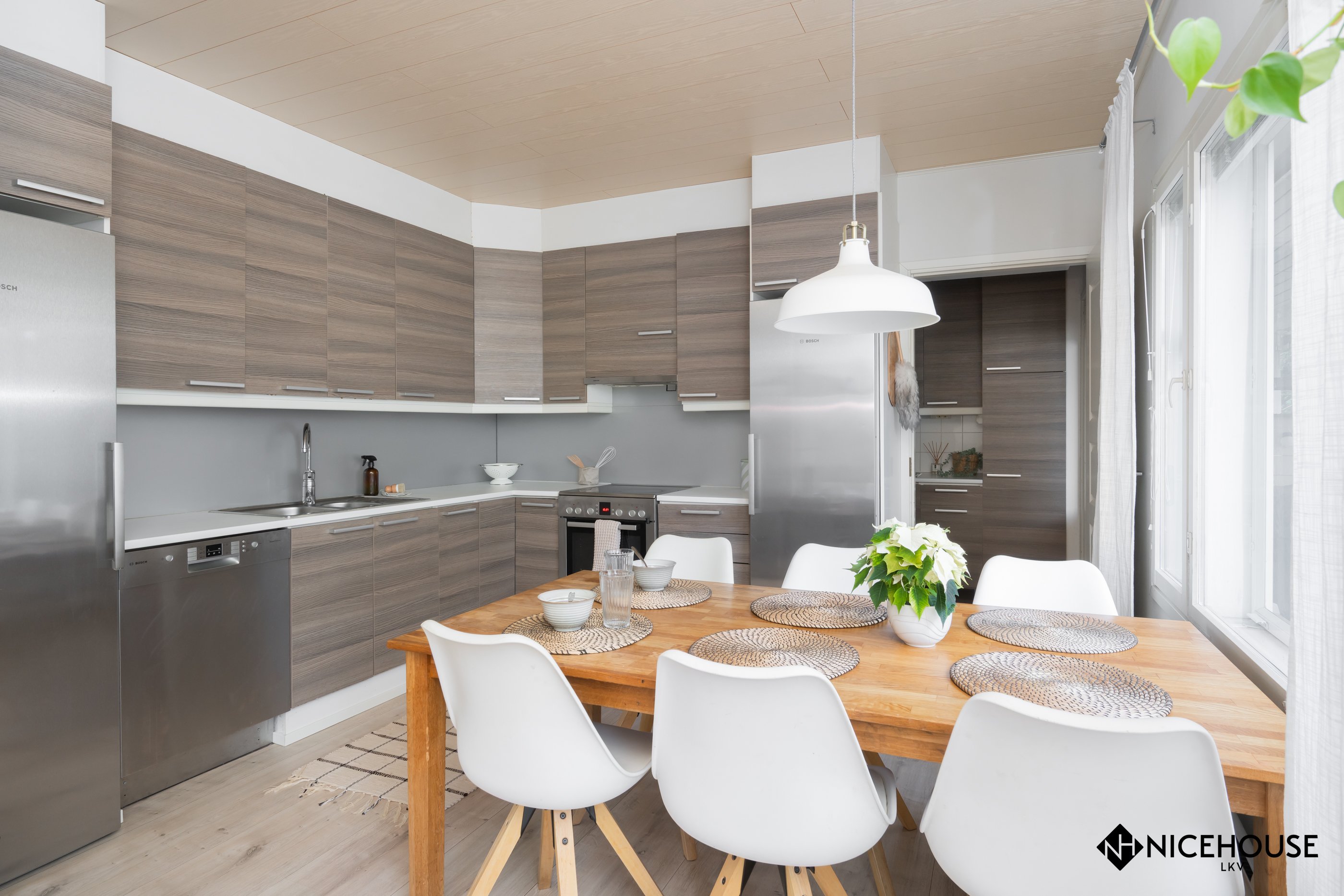 - Tyylikäs avokeittiö, missä on ikkunan ääressä tilaa ruokailuryhmälle. Keittiö muodostaa yhdessä olohuoneen kanssa avaran tilan oleskelulle.