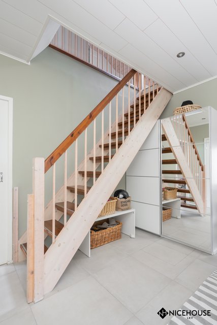 - Kylmä ulkovarasto, kaapistot ja käyttöullakolla varastohuone ja säilytystilaa.