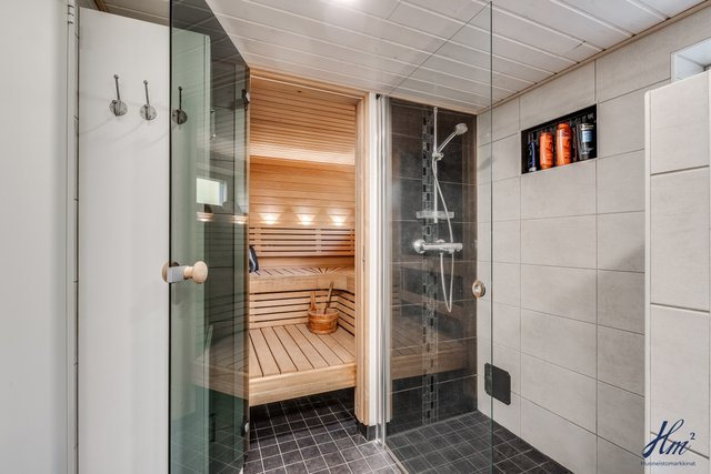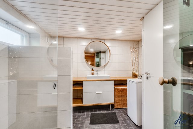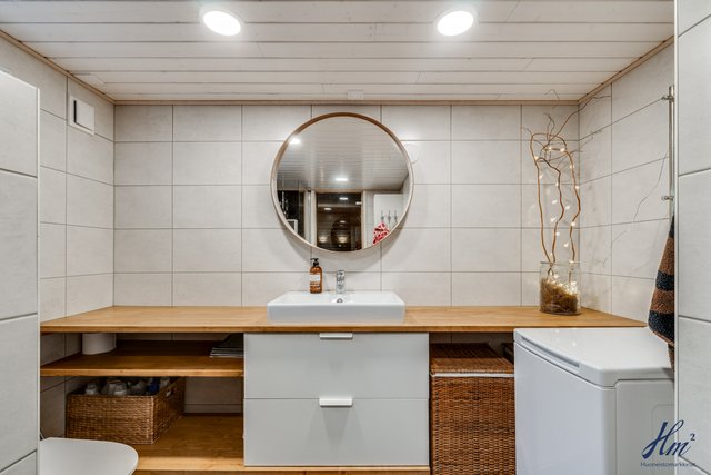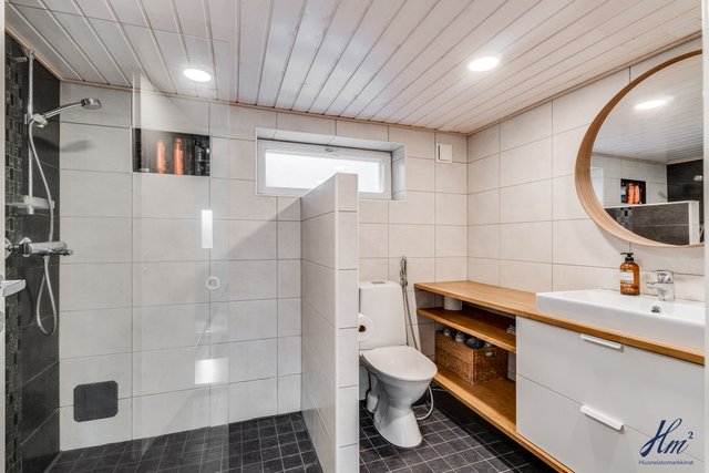 - WC-istuin, suihku, suihkuseinä, pesukoneliitäntä, peili, pesuallas, allaskaappi, lattialämmitys, ja bidee-suihku