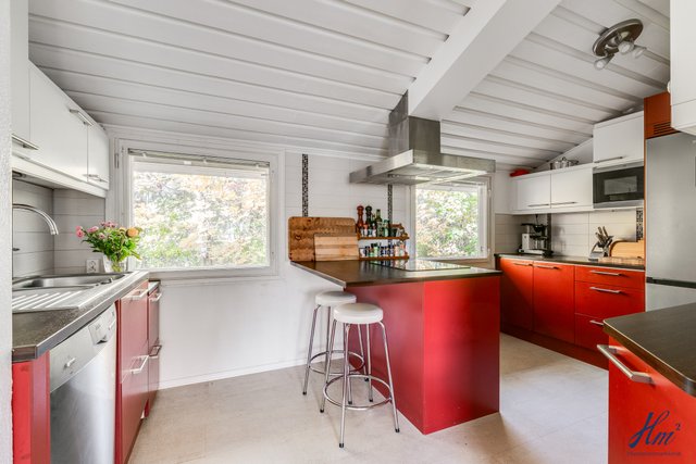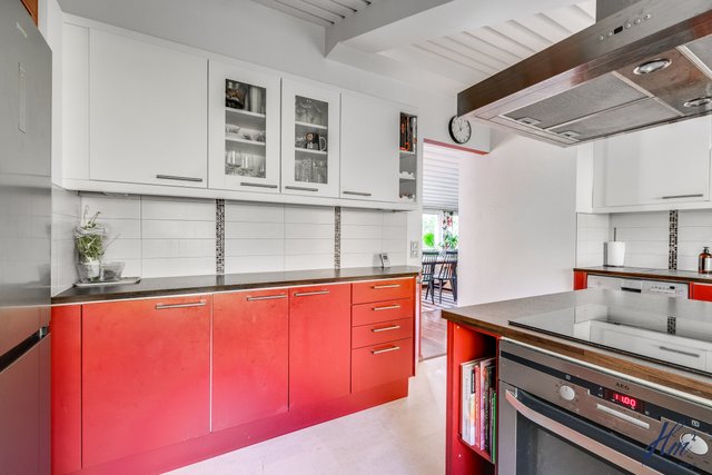 - Jääkaappipakastin, erillisuuni, liesituuletin, mikroaaltouuni, astianpesukone, keittiösaareke, ja liesi