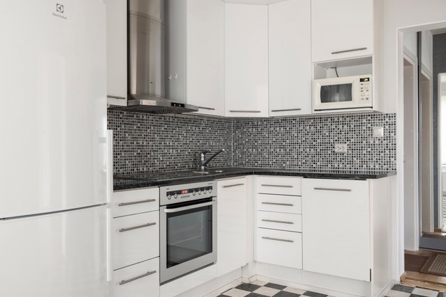 - Hyväkuntoinen keittiö, jossa valkoiset kaapistot. Kaappien välitila laatoitettu. AEG-kodinkoneita.