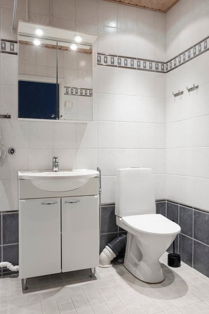 - WC-istuin, suihku, pesukoneliitäntä, peilikaappi, pesuallas, allaskaappi, ja bidee-suihku