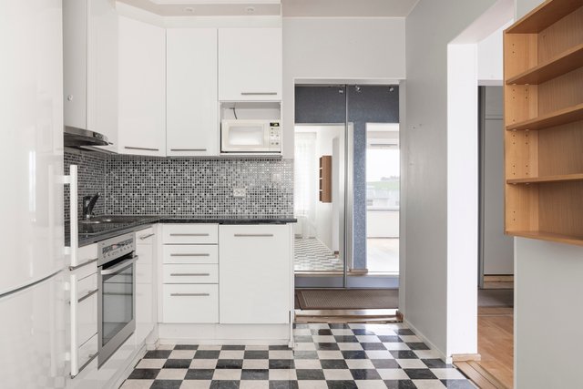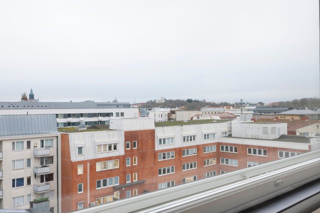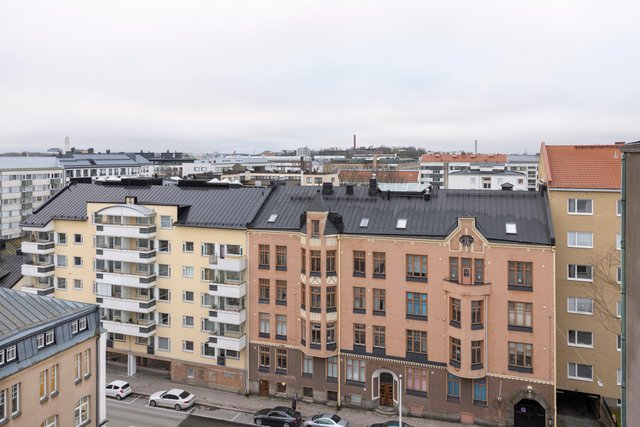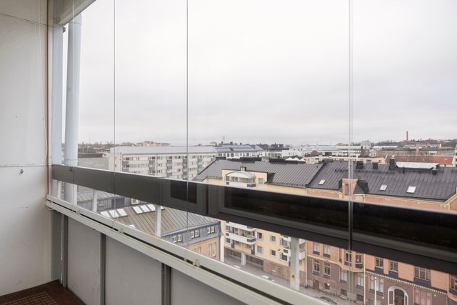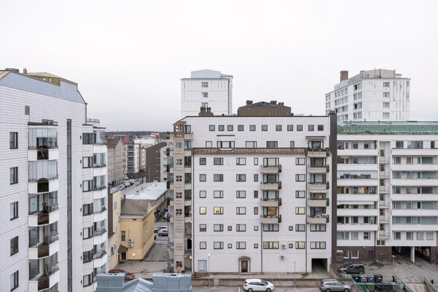 Aamulla heräät valoon. Sellaiseen, joka tulvii sisään ylhäältä – 9. kerroksesta, kaupungin yläpuolelta. Ikkunan takana maisema elää omaa rytmiään: katot, kadut ja taivas, joka tuntuu olevan hieman lähempänä kuin muualla. Tässä kodissa arki alkaa rauhallisemmin, vaikka keskusta sykkii aivan jalkojesi juuressa.