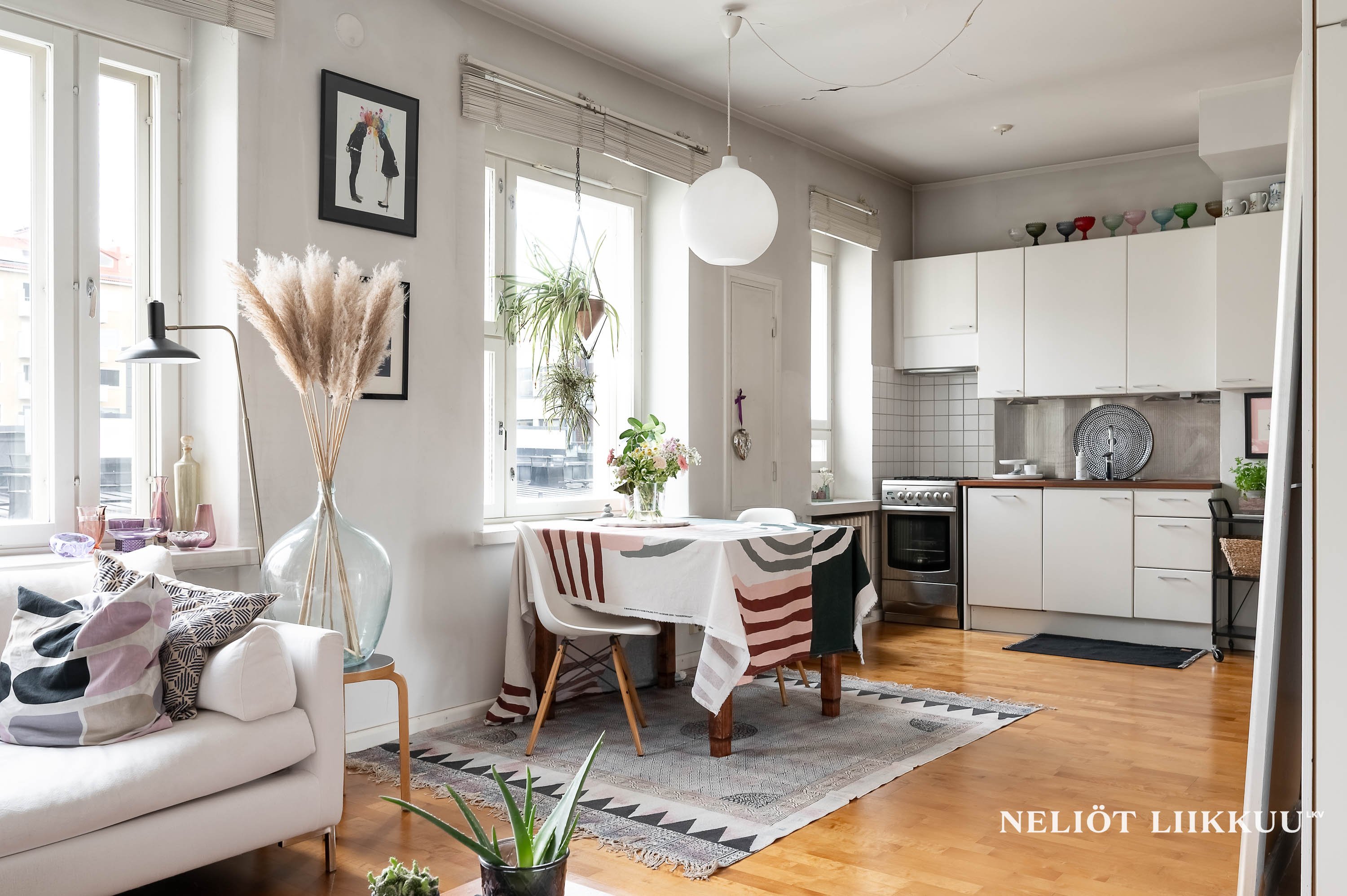 - Olohuone, ruokailutila ja keittiö nivoutuvat saumattomasti yhteen. Ikkunat kattojen yli koilliseen. Seinät ja katto maalattu, lattiassa parketti.
