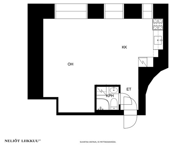 Tässä hissitalon 5. kerroksessa olevassa huoneistossa on aineksia moneen! Koillisseinän ikkunarivin ansiosta luonnonvalo tuo lämmintä charmia tähän kotiin. Avoin loft-tyyppinen pohjaratkaisu tekee asunnosta helposti omien tarpeiden ja tilanteen mukaan muokattavan. Suuri ikkunapinta yhdistettynä korkeaan huonetilaan luo rauhoittavaa tilan tuntua.