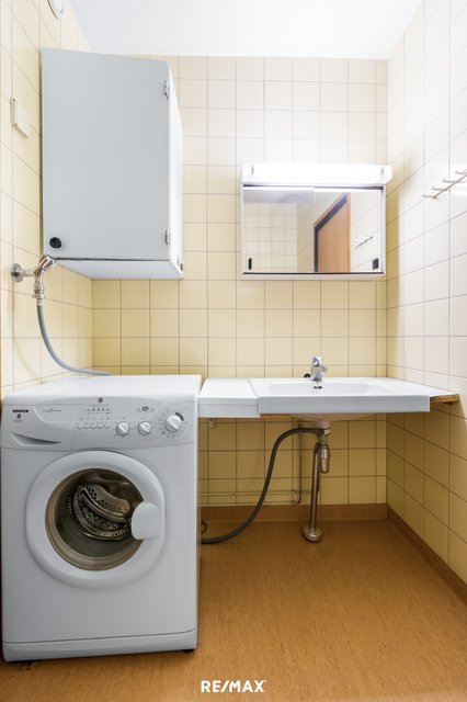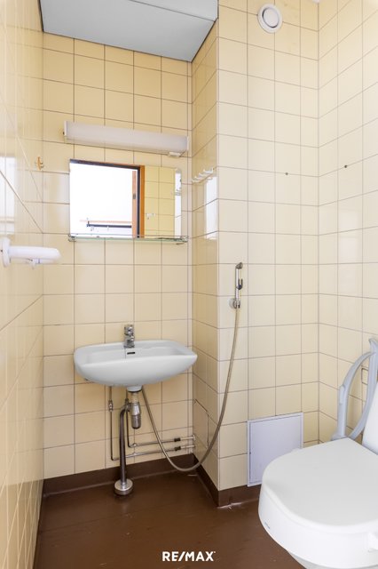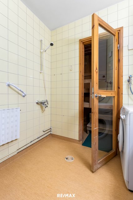 - Suihku, pesukoneliitäntä, peilikaappi, ja pesuallas