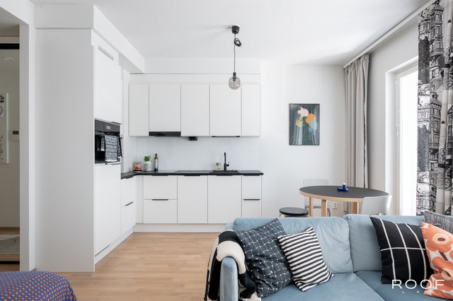 Keittiö hurmaa modernilla ilmeellään ja mustilla yksityiskohdillaan, kuten tyylikkäällä pöytätasolla, altaalla ja hanalla. Integroidut kodinkoneet sulautuvat siististi kokonaisuuteen ja tekevät arjesta sujuvaa.