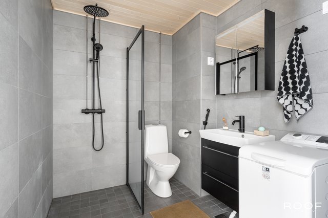 - WC-istuin, suihku, suihkuseinä, pesukoneliitäntä, peilikaappi, lattialämmitys, ja kylpyhuonekaapisto