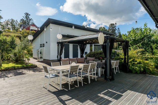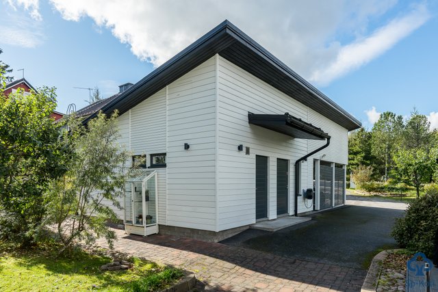 - Lisäksi erillinen autokatos ja varastorakennus, joka on 47 m2 asemapiirroksen mukaan. Rakennuksessa on kaksi tilavaa 19,9 m² varastohuonetta, molemmissa oma lämmitys. Toinen varastoista on pidetty jatkuvasti lämpimänä. Autokatoksen mitat on noin 7 x 6,5 m, mikä tarjoaa reilusti tilaa kahdelle autolle tai vaikkapa veneelle. Ilmoitetut neliöt perustuvat 13.12.2011 pääpiirustukseen.