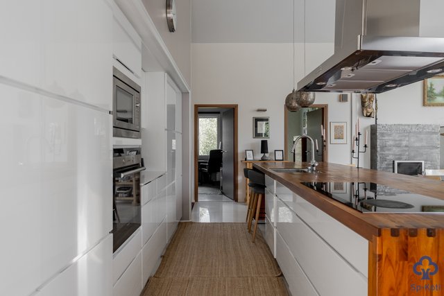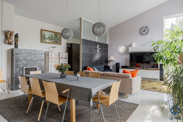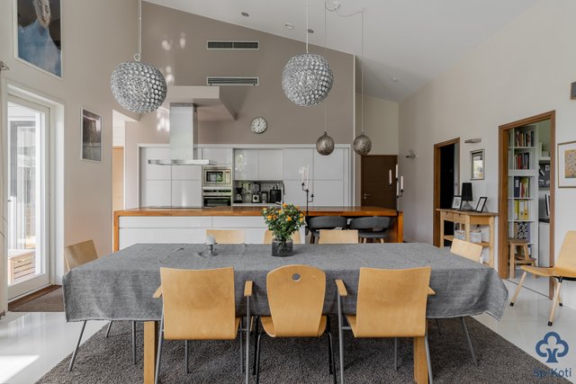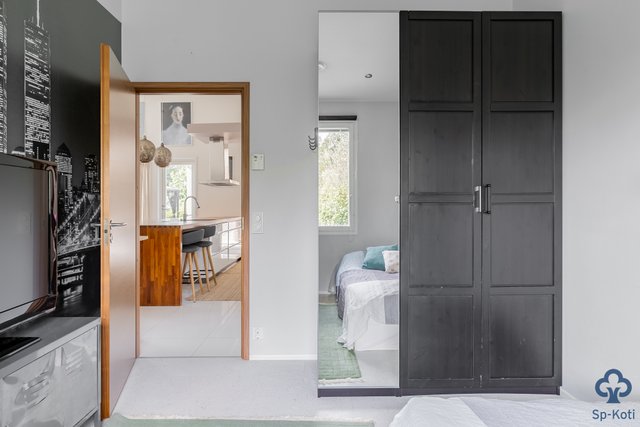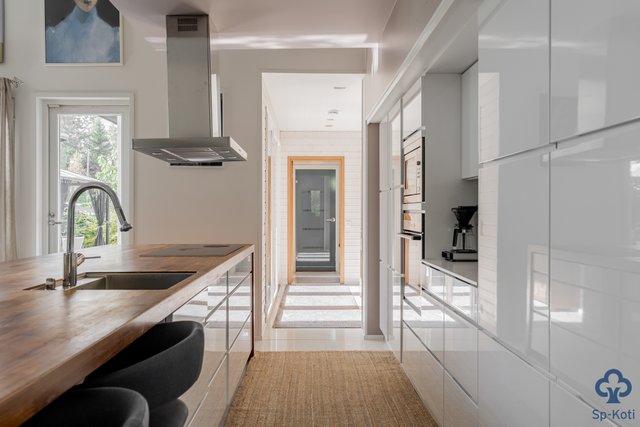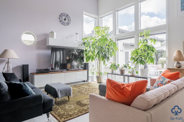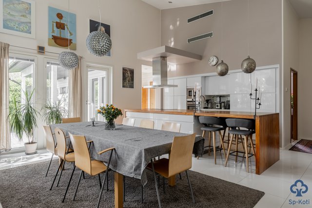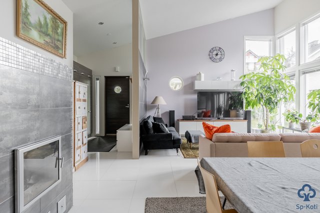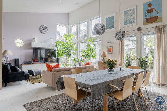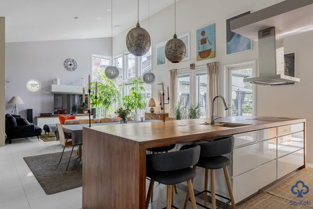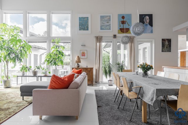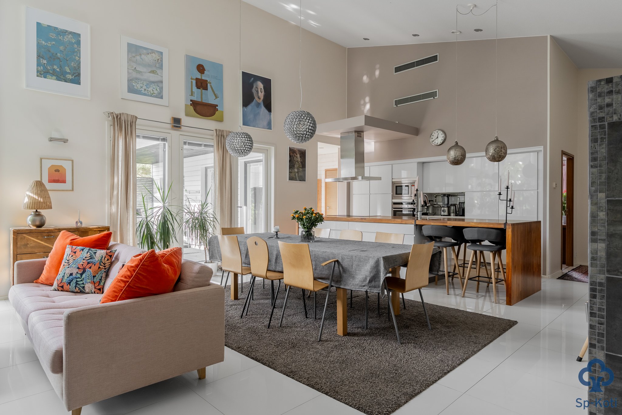 - Tämän kodin olohuone, ruokailutila ja keittiö muodostavat yhdessä vaikuttavan 64,5 m² kokoisen avaran kokonaisuuden, joka on todellinen katseenvangitsija ja kodin sydän. Huikea lähes 5 metrin huonekorkeus tuo tilaan poikkeuksellista avaruutta ja ilmavuutta, ja lattiasta lähes kattoon ulottuvat ikkunat tulvivat luonnonvaloa sisään koko päivän ajan. Suuret ikkunapinnat avaavat näkymän ulos ja tekevät tilasta yhtä aikaa sekä näyttävän että kutsuvan.