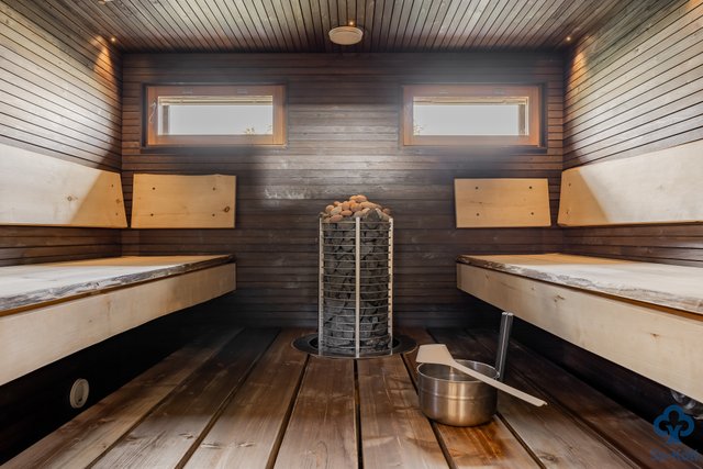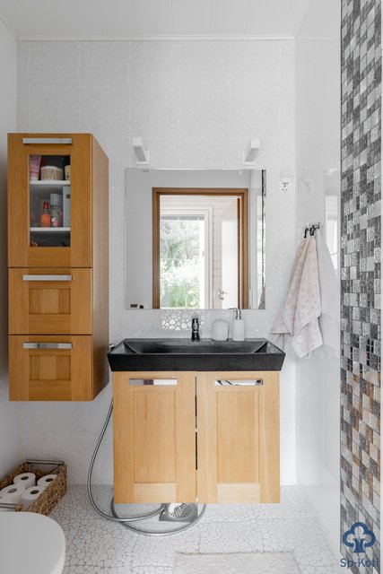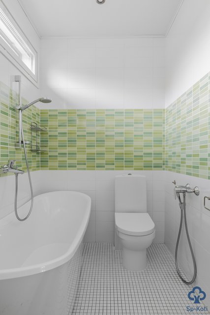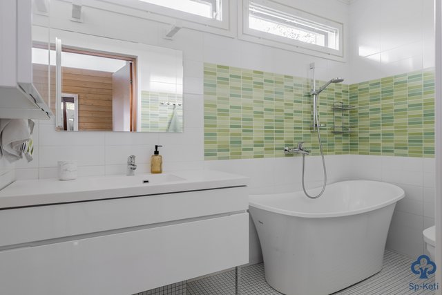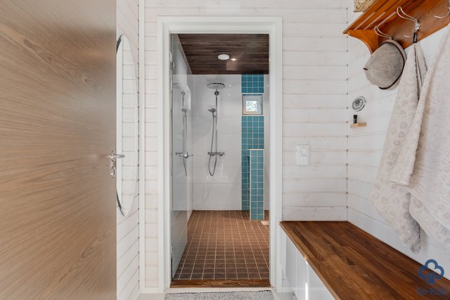- Kodissa on kaksi kylpyhuonetta. Sisäänkäynnin yhteydessä sijaitseva kylpyhuone on varustettu wc-istuimella ja kylpyammeella. Toinen kylpyhuone sijaitsee saunan yhteydessä ja se on varustettu kahdella suihkulla.