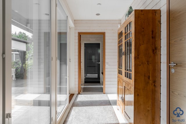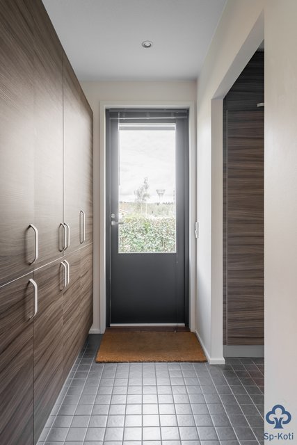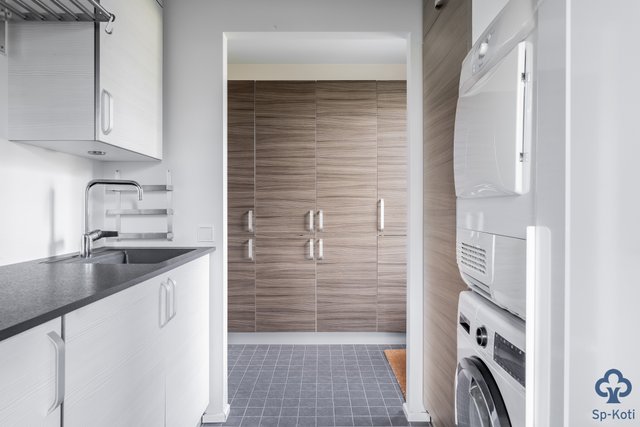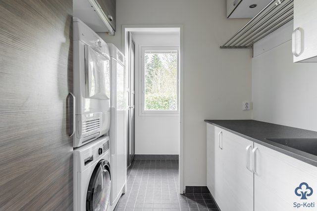 - Kodinhoitohuoneessa on runsaasti kaappi- ja laskutilaa. Varusteluun kuuluu pyykinpesukone, kuivaaja sekä erillinen kuivauskaappi. Kodinhoitohuoneen takana on lisäksi erillinen vaatehuone. Tilasta on käynti suoraan ulos.