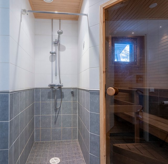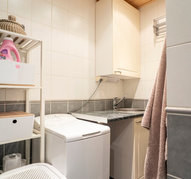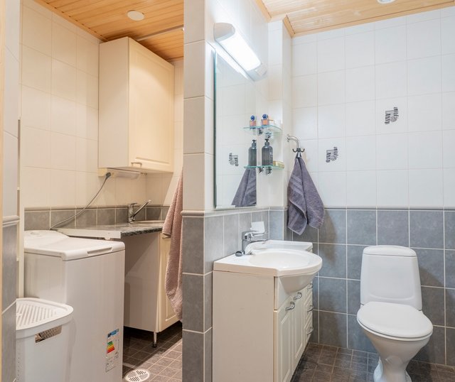 - Pesukoneliitäntä, lattialämmitys, wc-istuin, suihku, ja peili