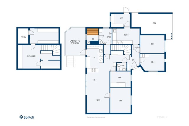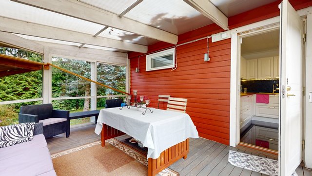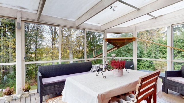 Ulkotiloissa katettu ja lasitettu terassi toimii täydellisenä paikkana aamukahville tai illanviettoon. Lisäksi käytössäsi on tilava kellari ja runsaasti säilytystilaa.