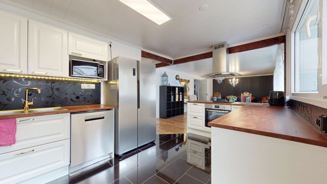 - Niemekkeellä olohuoneesta erotettu avoin tyylikäs keittiö.