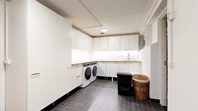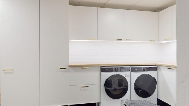 - Pesukoneliitäntä, lattialämmitys, pesuallas, ja pöytätaso