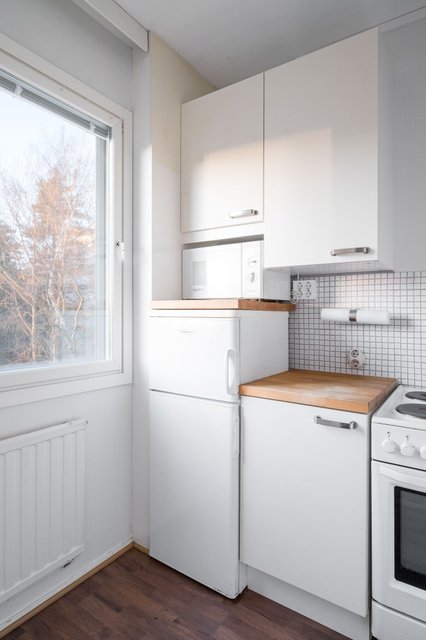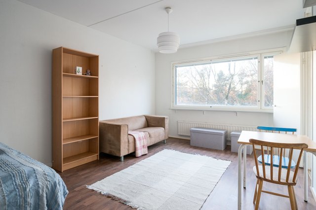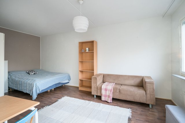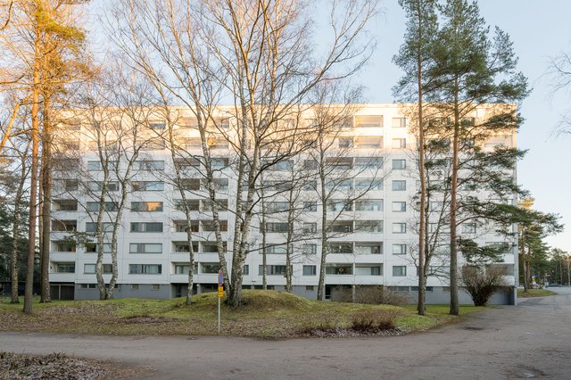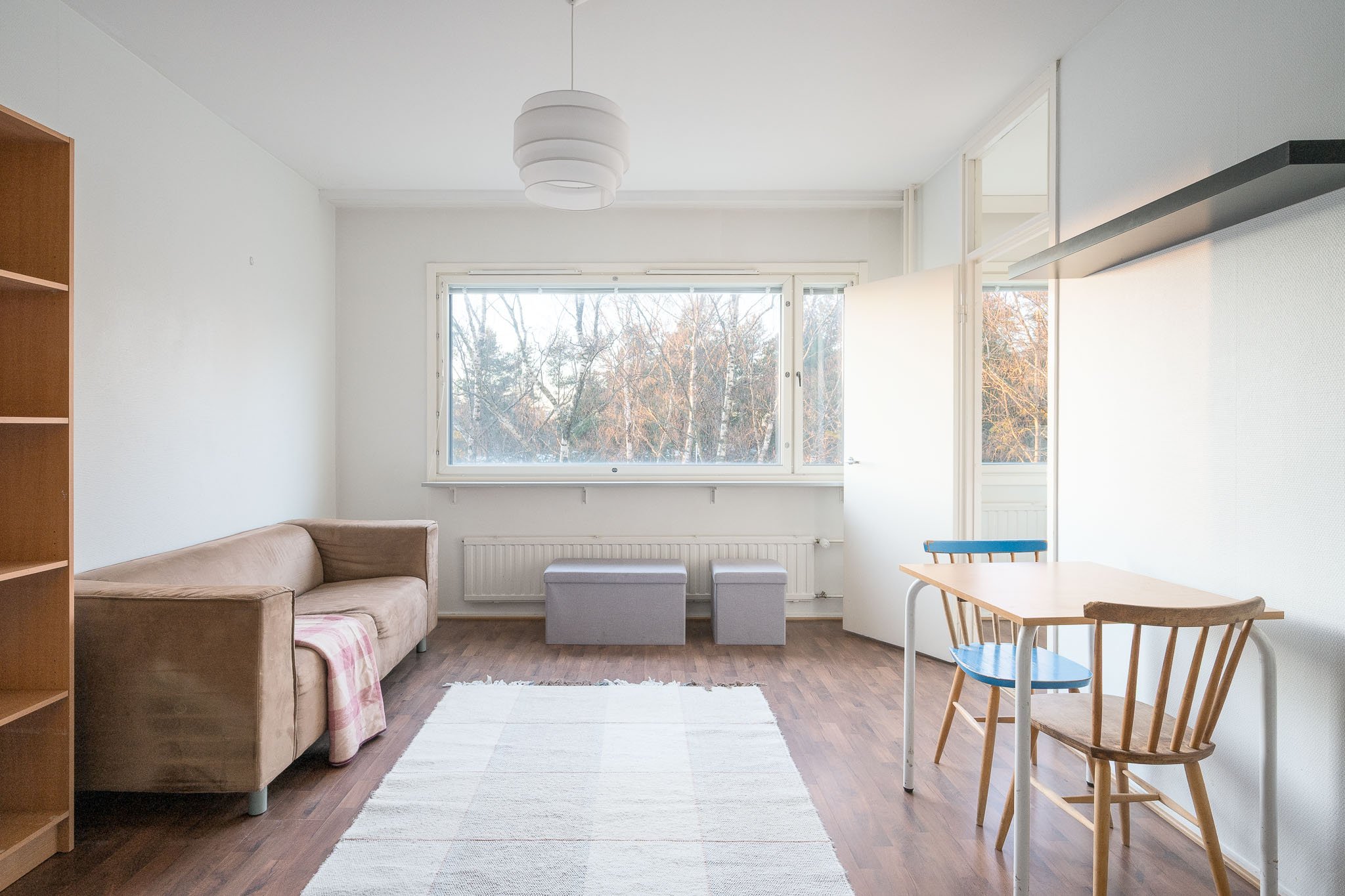 Hissitalon viidennessä kerroksessa on toimivalla pohjalla oleva yksiö. Tilavasta huoneesta on vehreät näkymät länteen. Keittokomero on kompakti, johon mahtuu pieni pöytä. Olohuoneessa on alkovi, johon mahtuu parisänky, olohuoneen puolelle mahtuu hyvin sohvaryhmä ja muut tarvittavat huonekalut. Moderni kylpyhuone, jossa oma paikka pesukoneelle ja kylpyhuone on uusittu linjasaneerauksen yhteydessä 2021.
