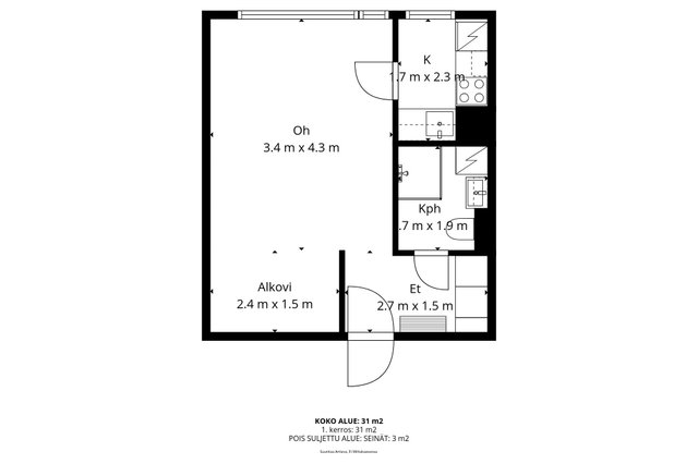 1h+kk+kph (yhtiöjärjestyksen mukaan 1h+kk)