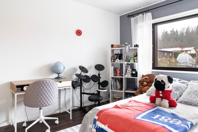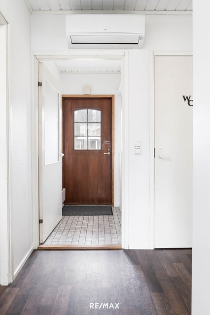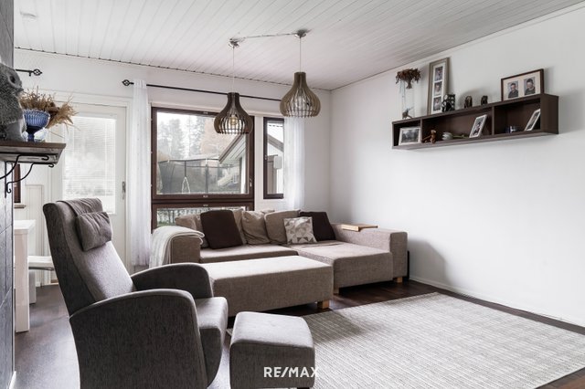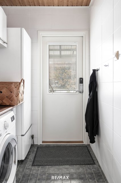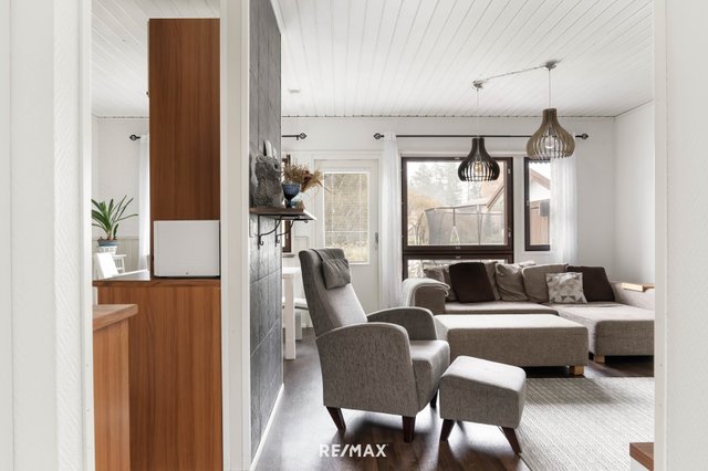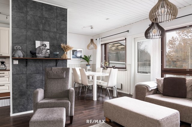 Ensivaikutelma tästä kodista on seesteinen ja lämmin. Suuret ikkunat päästävät valon sisään lähes joka suunnasta, ja vaaleat seinäpinnat korostavat tilan avaruutta ja joustovinyylimatto lattiapintana takaa kestävyyden vuosien päähän. Ensiaskeleella aistii, että tässä kodissa on mietitty niin toimivuutta kuin tunnelmaakin.