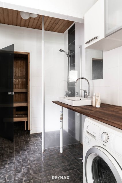 - Suihku, lattialämmitys, pesukoneliitäntä, pesuallas, peili, ja lämminvesivaraaja
