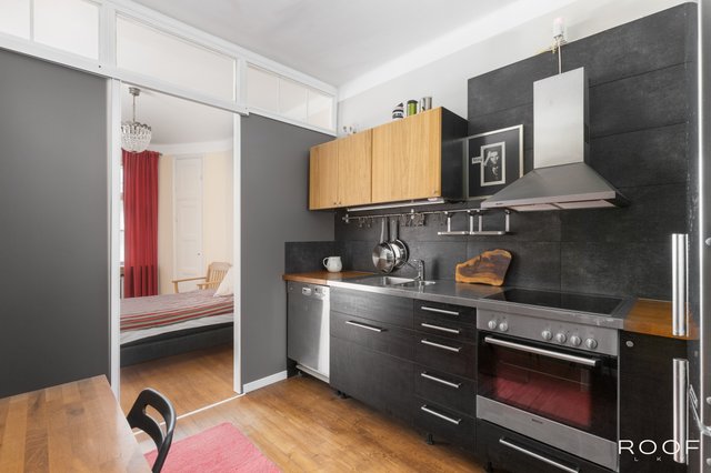 Avarasta eteisestä pääset kodin kaikkiin tiloihin: tilavan ja hyvin varustellun keittiön kautta on käynti sisäpihan puolelle avautuvaan makuuhuoneeseen.