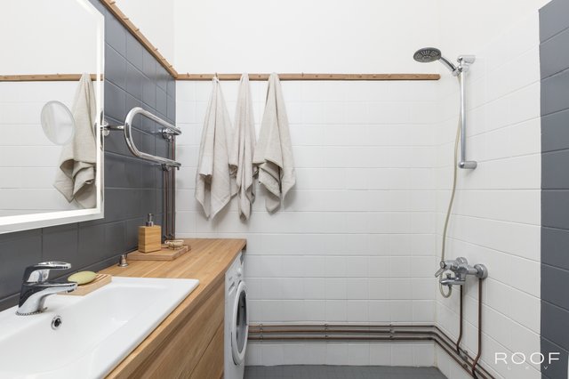 Kylpyhuone on sekin hyvän kokoinen; täällä on tilaa myös pyykkihuollolle. Toki yhtiöstä löytyy myös pesutupa asukkaiden käyttöön.