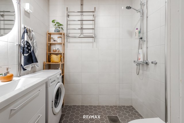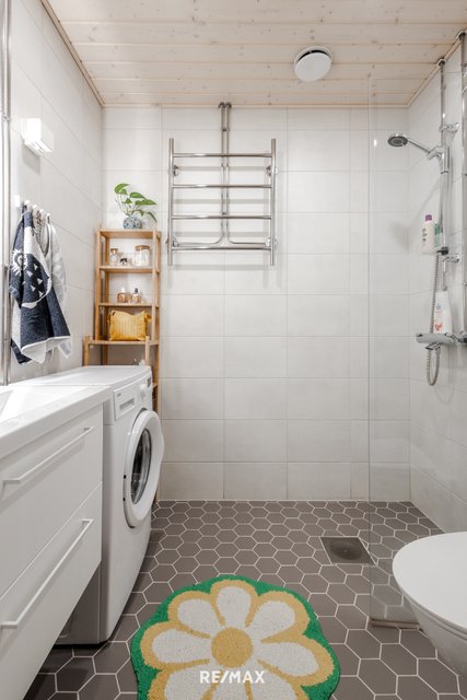 - WC-istuin, suihku, suihkuseinä, pesukone, pesukoneliitäntä, lattialämmitys, peili, pesuallas, allaskaappi, ja bidee-suihku