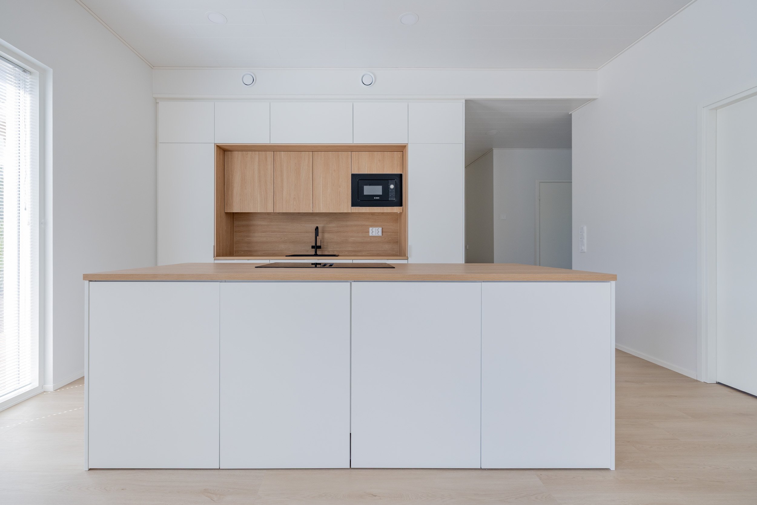 - Jääkaappi (integroitu), mikroaaltouuni (integroitu), astianpesukone (integroitu), keittiösaareke, erillisuuni, liesi (induktioliedessä itsessään liesituuletin), ja erillinen pakastin (integroitu)
