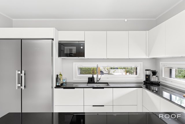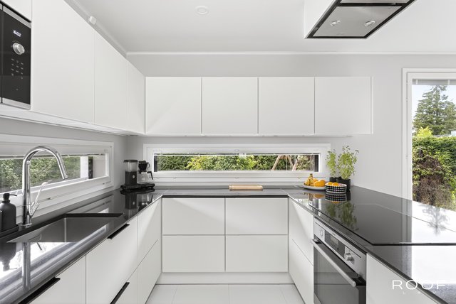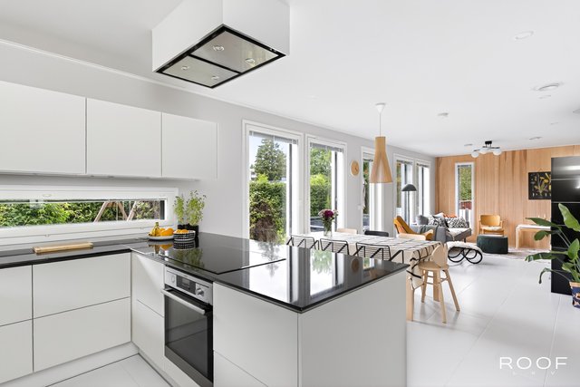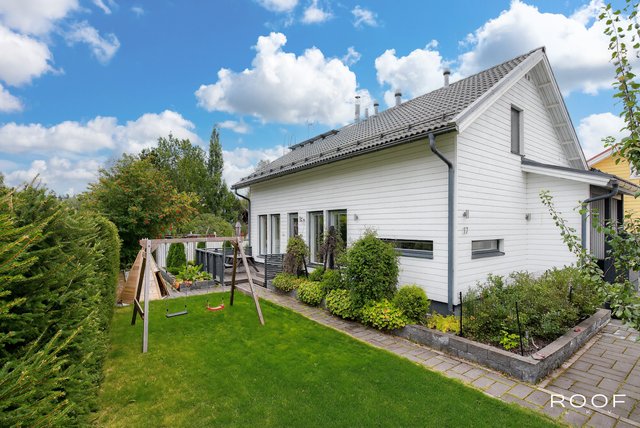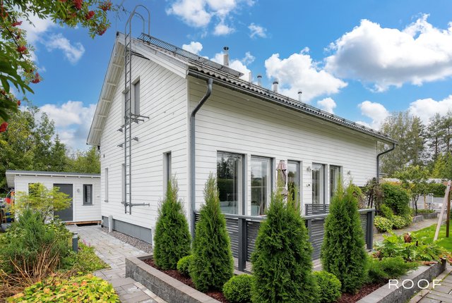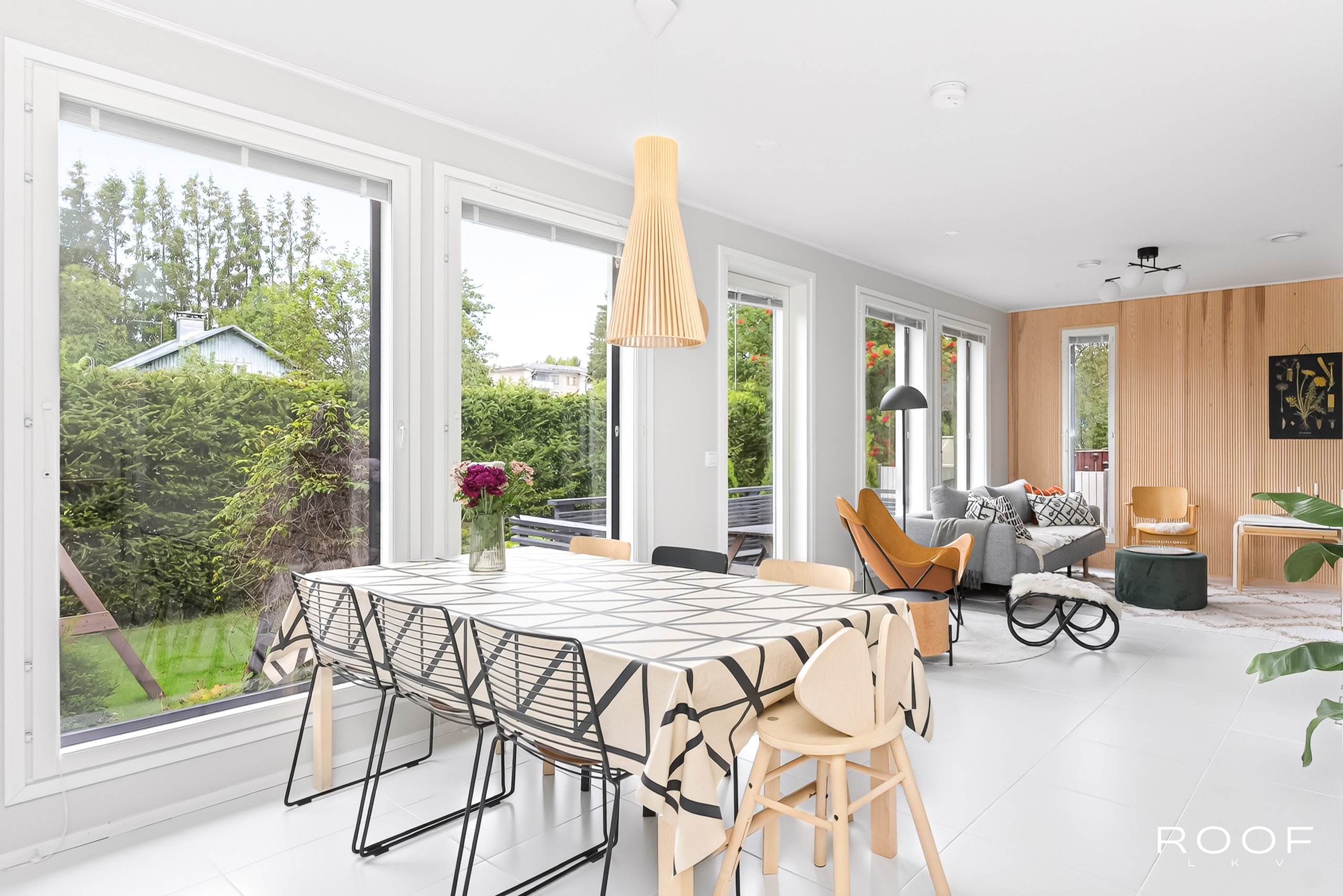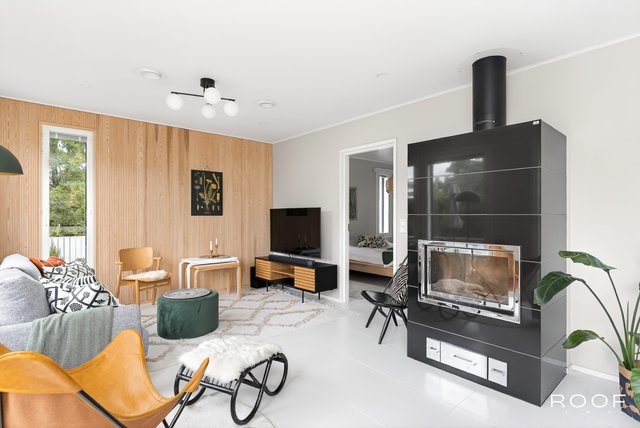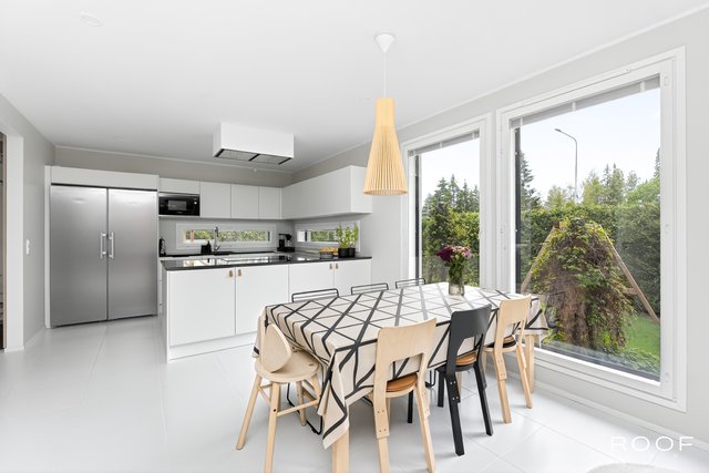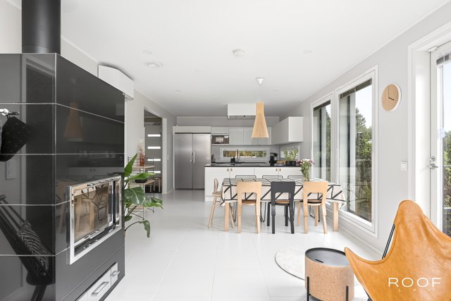 Koti henkii harmonista tunnelmaa ja laadukkaita materiaaleja. Jo sisään astuessa huomaat, kuinka tarkkaan harkitut yksityiskohdat ja tilaratkaisut tekevät arjesta sujuvaa ja viihtyisää. Avarassa olohuoneessa suuri varaava takka tuo lämpöä ja kutsuu rentoutumaan. Keittiö on moderni ja hyvin varusteltu ja sen saareke luo luonnollisen kokoontumispaikan perheen ja ystävien hetkiin. Suuret ikkunat tulvivat valoa sisään ja avaavat näkymät omalle, suojaisalle pihalle.
