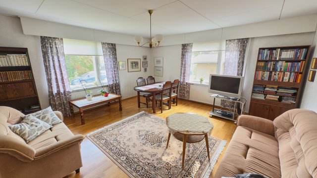 - Tilava olohuone, jonne mahtuisi myös illallispöytä. Valoisa, ikkunoita kahteen eri suuntaan. Olohuoneessa on myös kaunis, käyttökuntoinen kakluuni.