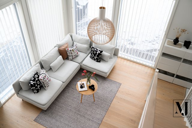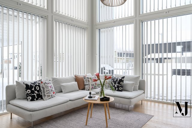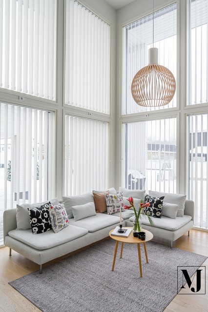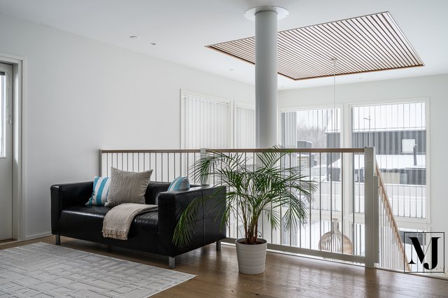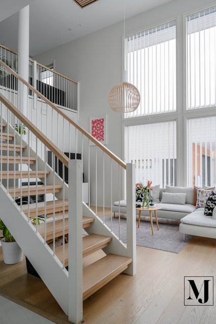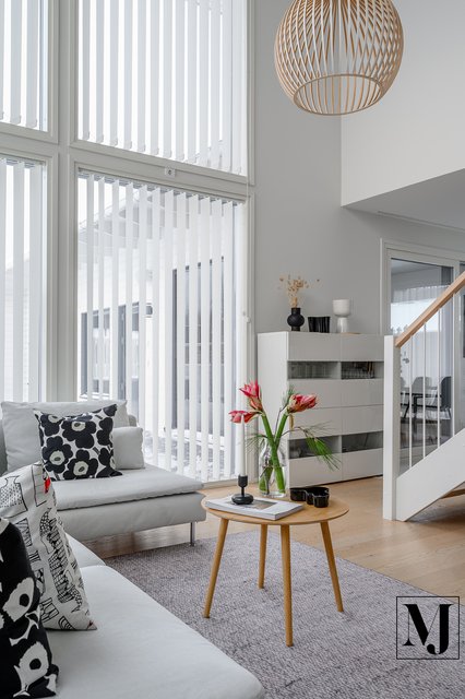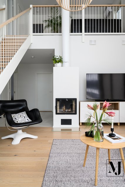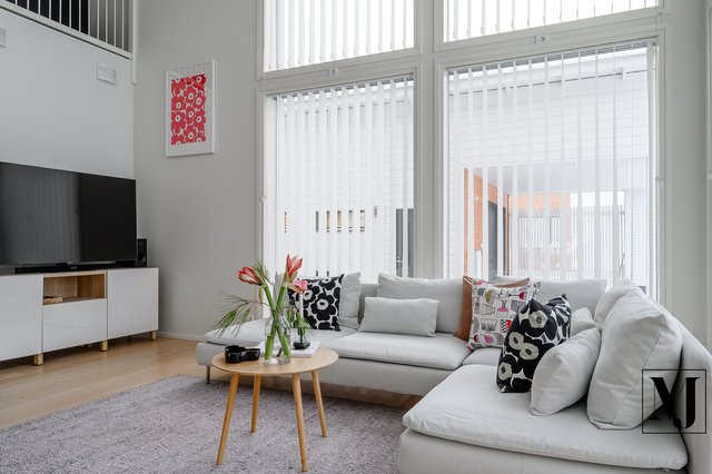 Olohuone hurmaa korkealla huonekorkeudella, suurilla ikkunoilla ja kauniilla varaavalla takalla. Olohuone muodostaa keittiön ja ruokailutilan kanssa yhtenäisen, avaran kokonaisuuden jossa viihdytään.