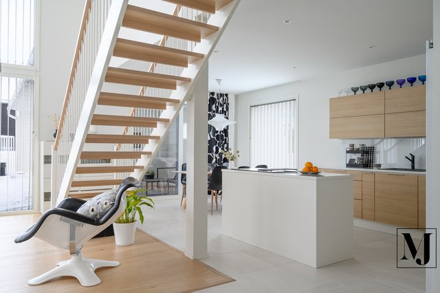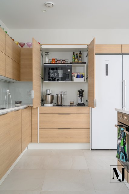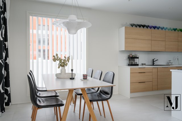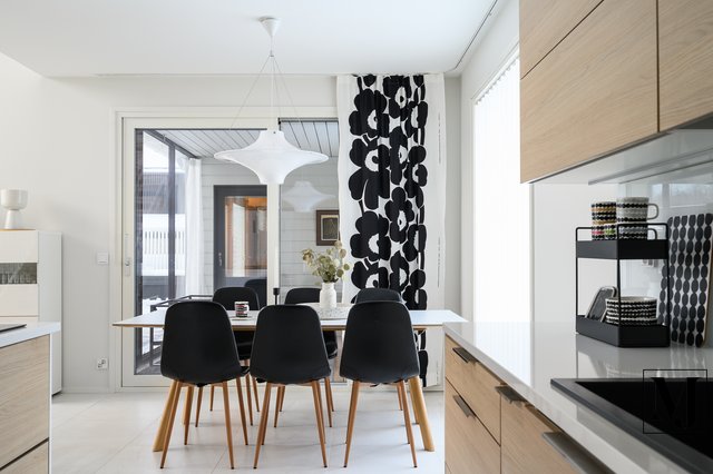 - Avara ja moderni keittiö saarekkeella, jossa integroitu liesituuletin tuo käytännöllisyyttä arkeen. Lämmin tammi yhdistyy raikkaaseen valkoiseen Silestonen kvartsipöytätasoon luoden ajattoman ja tyylikkään kokonaisuuden. Keittiöstä löytyy runsaasti kaappi- ja laskutilaa sekä laadukkaat kodinkoneet: jääkaappi, pakastinkaappi, induktioliesi, erillisuuni, kalusteisiin integroidut mikroaaltouuni ja astianpesukone. Aamiaiskaappi sulautuu myös kokonaisuuteen. Tilava ruokailutila tarjoaa tilaa isommallekin ruokailuryhmälle.