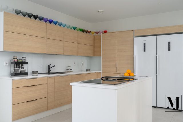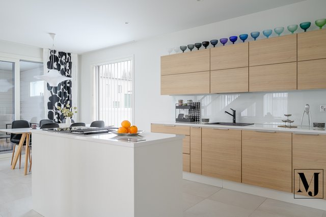 Tässä valoisassa ja avara keittiössä yhdistyy lämpimän puun ja valkoisen ajaton värimaailma. Tilava saareke integroidulla liesituulettimella sekä monipuoliset säilytystilat tarjoavat runsaasti kaappi- ja laskutilaa, mikä tekee arjesta sujuvaa. Keittiössä on tilaa kokkailuun ja yhteisiin hetkiin. Keittiön toiminnallisuus tekee tästä kodin sydämen jossa arki ja juhlat sujuvat luontevasti.