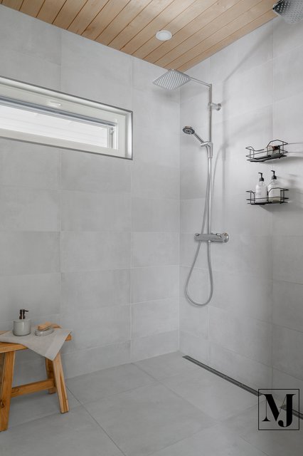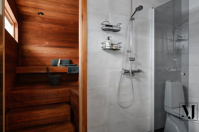 - Saunarakennuksen pesutiloissa on suihku, suihkuseinä ja wc-istuin. Päärakennuksessa on tilava kylpyhuone jossa kaksi sadesuihkua.