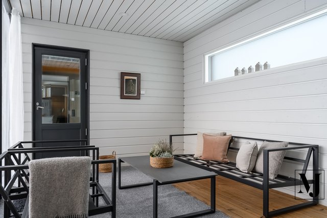 Olohuoneesta on käynti lasitetun terassin tai oman sisäänkäynnin kautta saunan puolelle.