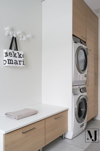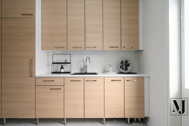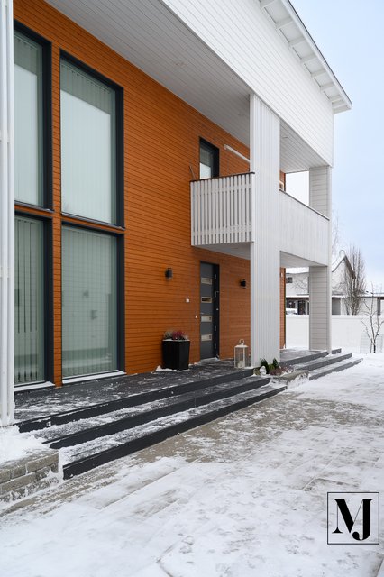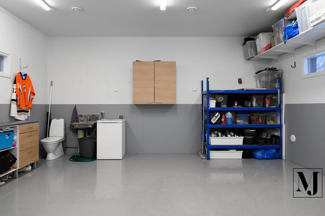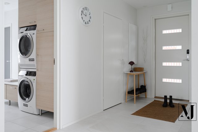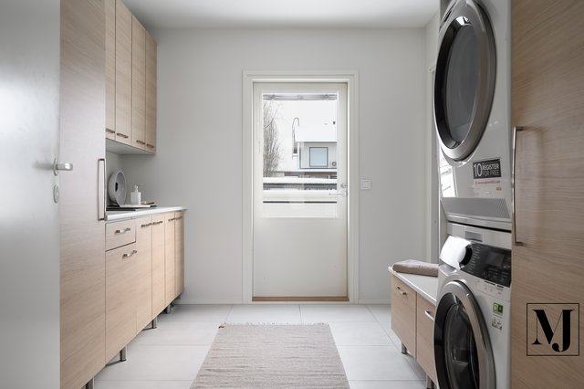- Erittäin tilava kodinhoitohuone, jossa on kaapistot, tasotilaa, pesuallas ja paikka pyykkitornille. Kodinhoitohuoneesta on myös oma uloskäynti.