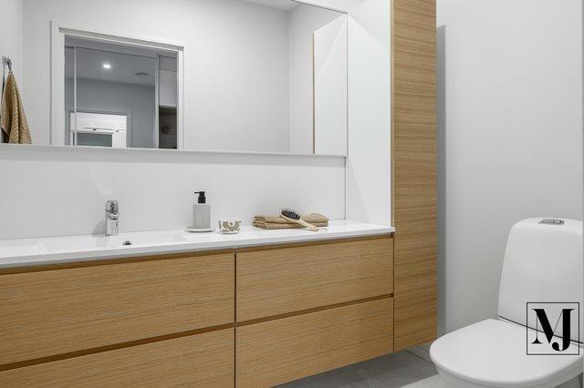 - Ylä- ja alakerrassa on omat wc:t, jotka ovat tyylikkäät ja tarjoavat runsaasti säilytystilaa.