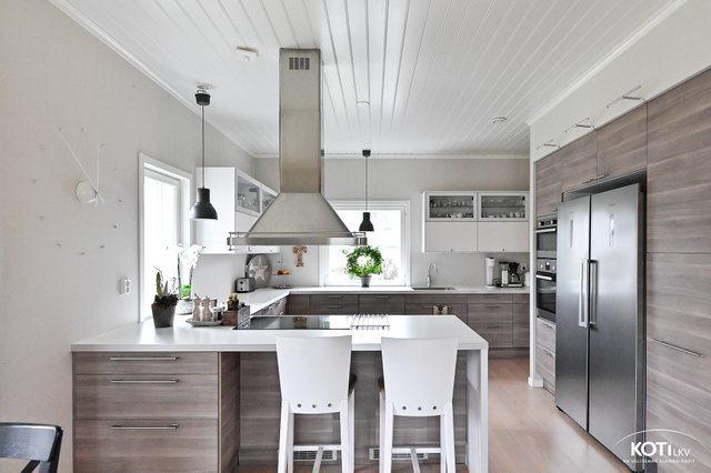 - Tilava avokeittiö jossa runsaasti säilytys- ja työskentelytilaa. Korkea jääkaappi ja pakastin (2024), induktioliesi, integroidut erillisuuni ja mikroaaltouuni, integroitu astianpesukone (2023), saarekkeessa kaksi kylmävetolaatikkoa, liesituuletin omalla hormilla.