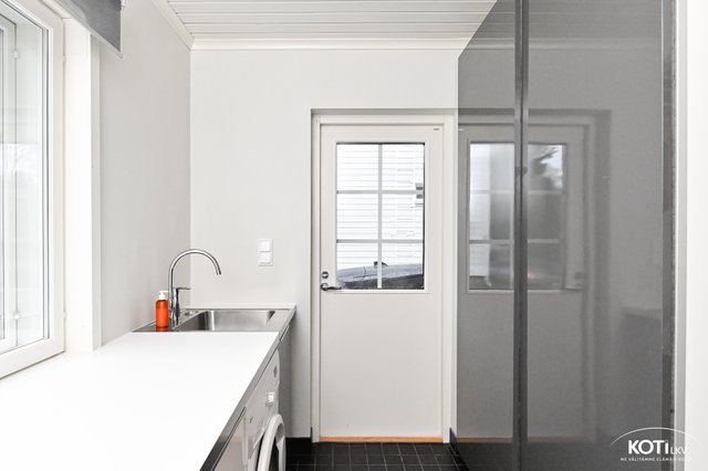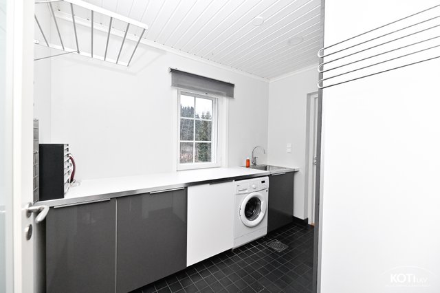 - Alakerrassa tilava, ikkunallinen kodinhoitohuone josta käynti ulos. Allas, kaapistot, pesukoneliitäntä, ikkuna, lattiakaivo, lattia laatoitettu.
