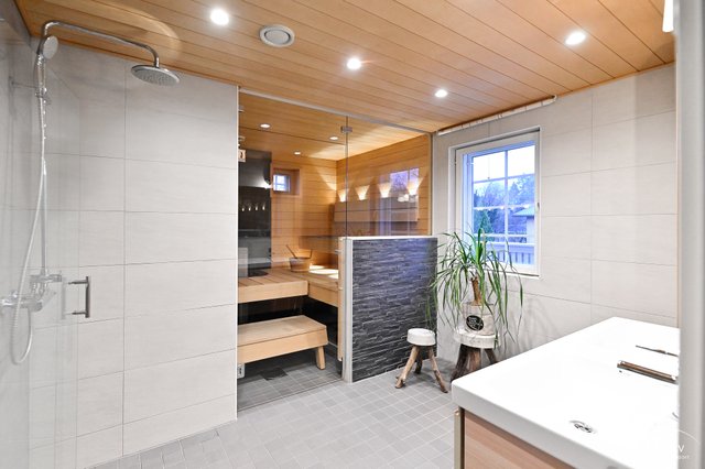 - Alakerrassa erillinen kylpyhuone/wc. Sadesuihku lasiovilla, peilikaappi, allaskaappi, kokonaan laatoitettu. Yläkerrassa saunan yhteydessä tilava kylpyhuone. Suihku, leveä allastaso kahdella altaalla, peili, kaappi.