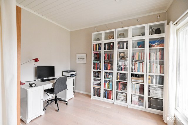 Alakerta on kodin sydän. Avarassa olohuoneessa on varaava takka tuomassa lämpöä ja tunnelmaa. Tyylikäs keittiö on varustettu monipuolisin kodinkonein, ja valoisa erkkeri tarjoaa ihanteellisen paikan isommallekin ruokailuryhmälle. Olohuoneen jatkeena on pariovien takana viehättävä kirjastohuone, joka toimii erinomaisesti myös makuu- tai työhuoneena. Molemmissa kerroksissa on suihkulliset kylpyhuoneet, mikä helpottaa arkea isommassakin perheessä. Tilava kodinhoitohuone omalla sisäänkäynnillä on todellinen arjen pelastus, erityisesti lapsi- ja lemmikkiperheille.
