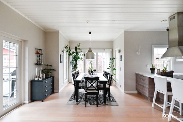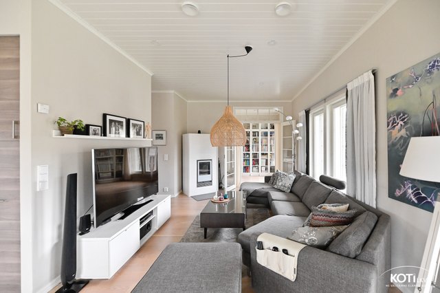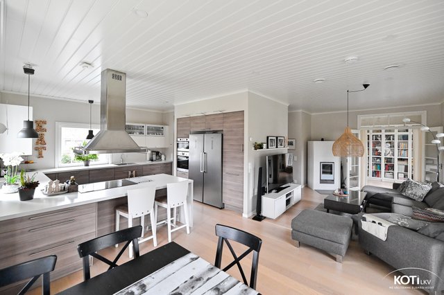 - Avara ja valoisa olohuone-ruokailutila-avokeittiö muodostovat viihtyisän kokonaisuuden. Olohuoneessa Tulikiven varaava takka. Kulku tilavalle, katetulle terasille ja pihalle.