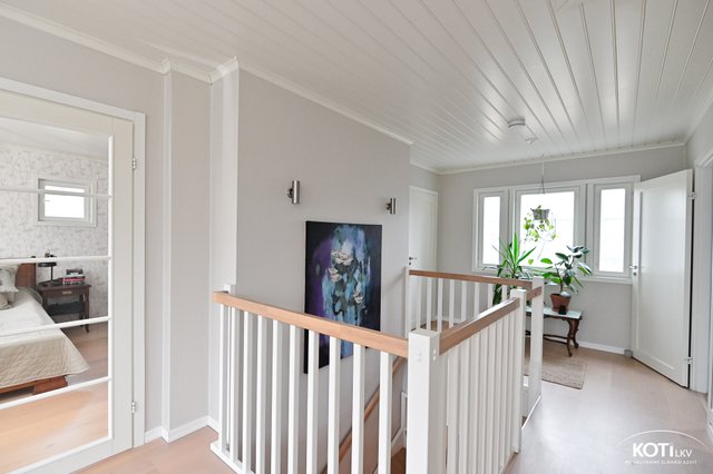 Yläkerrasta löytyy kolme makuuhuonetta, joista kahden yhteydessä on oma vaatehuone. Saunaosasto kutsuu rentoutumaan – tilava sauna tarjoaa leppeät löylyt, ja vilvoittelu onnistuu kätevästi viereisellä parvekkeella. Myös yläkerran aulatila on monikäyttöinen ja soveltuu esimerkiksi perheen yhteiseksi oleskelutilaksi tai työpisteeksi.