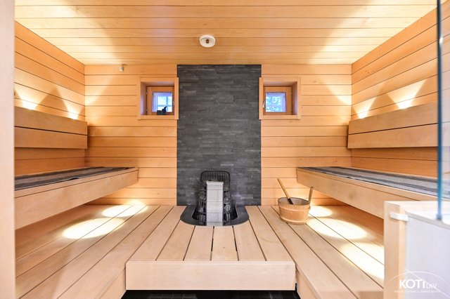 - Yläkerrassa tilava, ikkunallinen sauna. Pilarikiuas, tervaleppälauteet, lasiseinä kylpyhuoneeseen. Yläkerran aulan kautta vilvoittelemaan parvekkeelle.