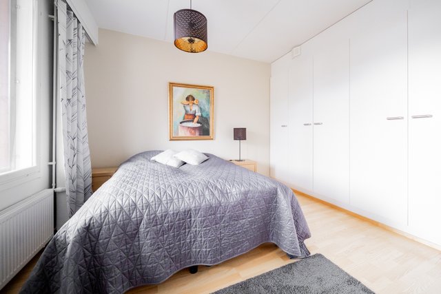 - Tilava makuuhuone, jossa hyvin kaappitilaa säilytykseen.