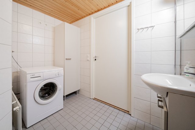 - Kylpyhuoneessa harmaat ja valkeat laattapinnat, pyykkikaappu sekä paikka pyykinpesutornille.