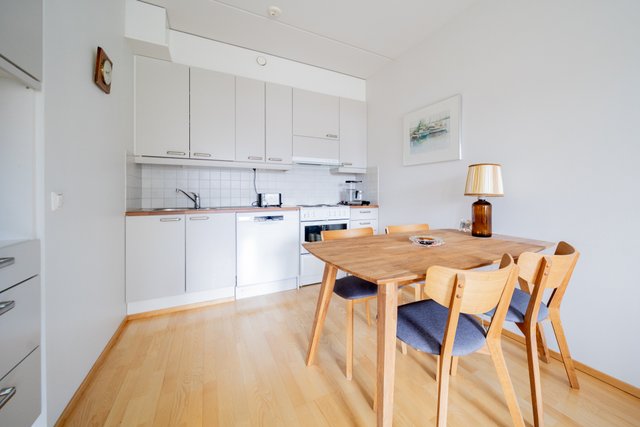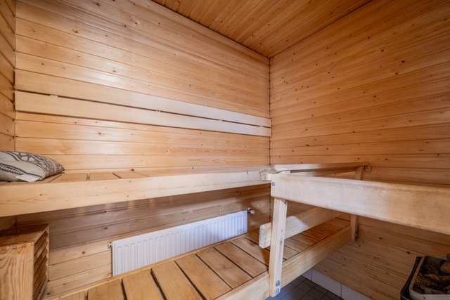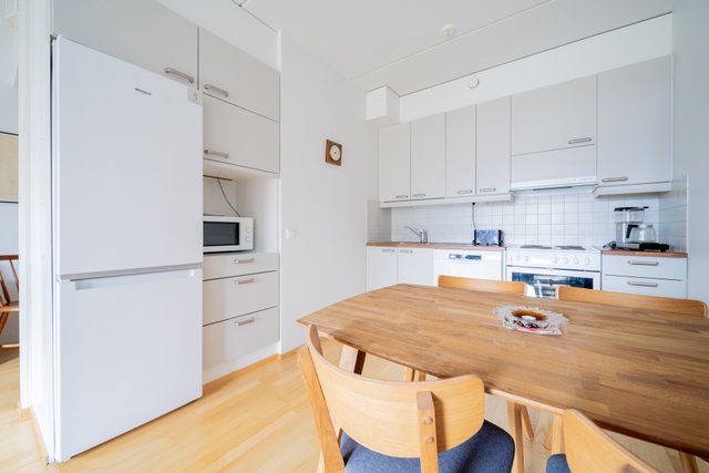 Keittiössä on riittävästi kaappitilaa ja paikka ruokapöydälle. Makuuhuone on tilava ja tarjoaa hyvin säilytystilaa. Kylpyhuoneessa on harmaat ja valkoiset laattapinnat sekä paikka pyykinpesutornille. Lisäksi asunnossa on oma sauna, jossa voi rentoutua päivän päätteeksi.