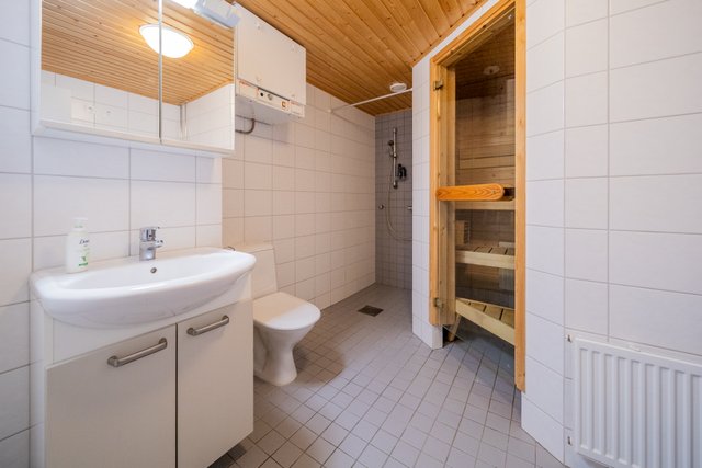 - WC-istuin, suihku, pesukoneliitäntä, lattialämmitys, peilikaappi, pesuallas, allaskaappi, ja bidee-suihku