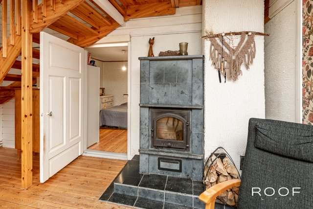 Hirsirakenteisessa vierasmökissä kamiina, puuhella ja ilmalämpöpumppu.