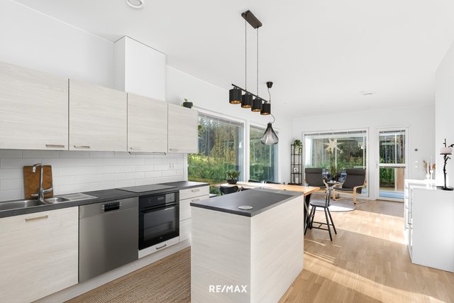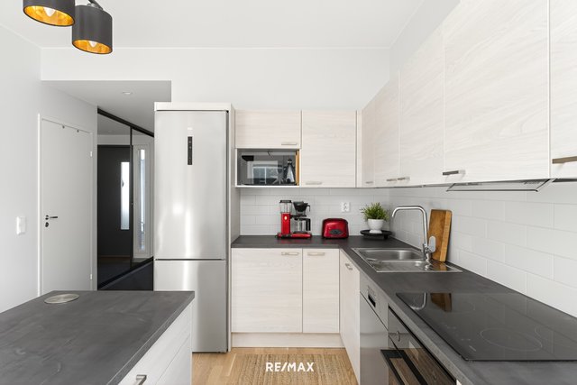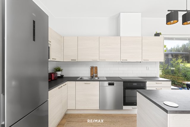 - Opdeco-keittiö, jossa jää/pakastinkaappi, erillisuuni, induktioliesi, astianpesukone, kodinkoneet AEG. Liesituuletin huippuimurilla. Keittiössä saareke, sähköpistoke. Työtasot laminaattia. Lattia vaaleaa tammiparkettia, seinät maalattu.